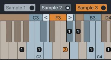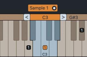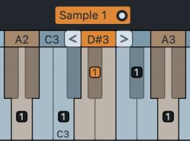 Multiple Samples that are assigned to the same root key are visualized by a row of numbered sample labels placed above the Keyboard Zone. These labels act like radio button controllers for selecting the active sample to be included in the sample instrument.