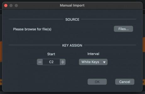The drop-down menu for the “Import” button provides a Manual Import option. In its dialog window, select one or more audio files and then choose the start key for the first sample and the interval at which samples should be assigned to the keys.