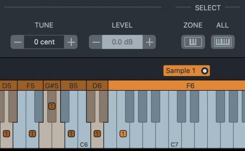 If multiple samples are assigned to the zone, focus the sample for editing by clicking its corresponding sample label above the keyboard.